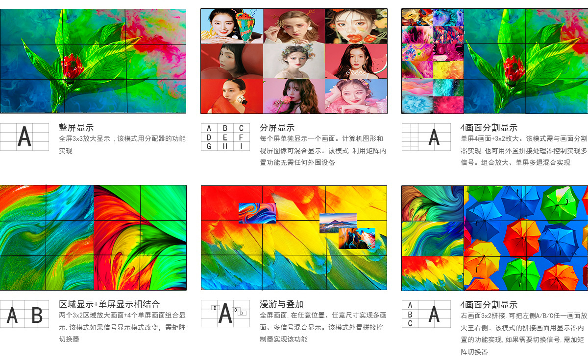 ②智能拼接,任意組合:客戶需求,怎么顯示怎么來;個性化個性設計、靈活多變、滿足不同需求、支持定制;多樣化的圖像拼接顯示,可以整屏顯示、分屏顯示、多畫面分割顯示、區(qū)域顯示加單屏顯示相結合、漫游與疊加。