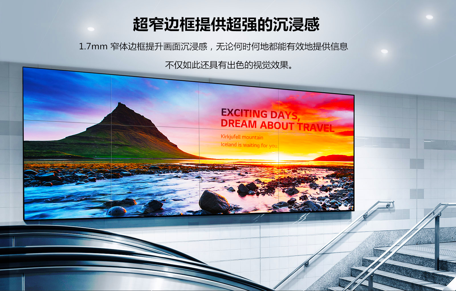 55寸液晶拼接屏1.7mm系列雙邊拼接僅有1.7mm,超窄拼縫,采用韓國三星LG工業級原裝面板,尺寸比46寸系列更大,區別在于用戶選擇上,不同的現場環境,尺寸大小一旦固定,則需要計算46和55寸的尺寸大小來選擇拼接屏,55寸拼接屏1.7mm長寬高尺寸為:1211.54*682.34*71.7mm;支持1×2;1×3;2×2;2×3……更多單元拼接。