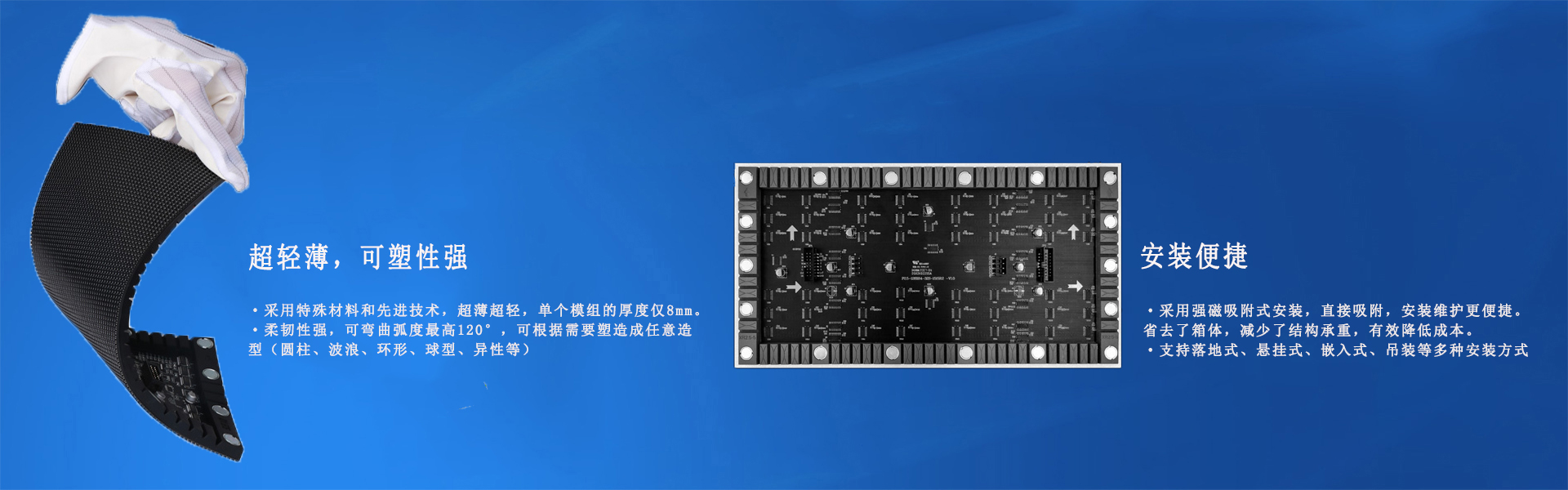 1.安裝適應力強:采用強磁吸附式安裝,直接吸附,安裝維護更便捷。省去了箱體,減少了結構承重,有效降低成本。支持落地式、懸掛式、嵌入式、吊裝等多種安裝方式。